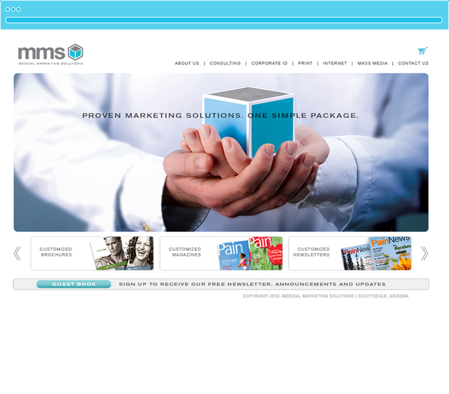 We created a logo and brand that featured a small box, sometimes shown in the hands of an established physician. “Proven marketing solutions. One simple package”. The palette was inspired by the colors typically found on medical scrubs. The icon resembles a box or package while the font suggests a strong trustworthy brand.